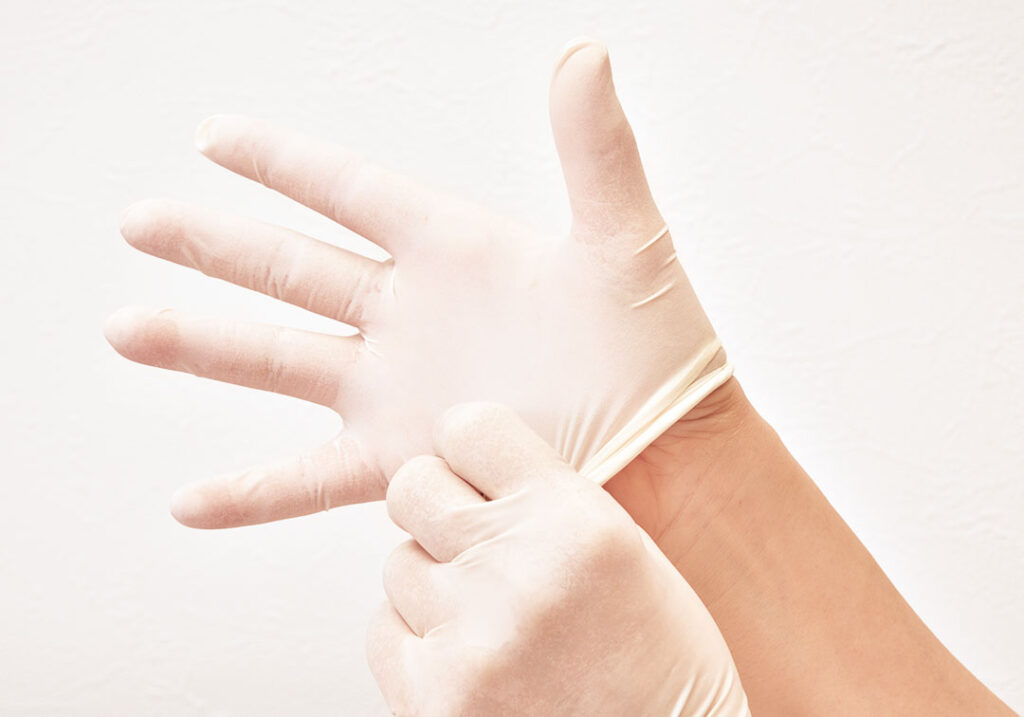皮がむけ血が出てくるほどの状態ならば本来、手を使うことをやめ包帯で保護するはず。手袋をはめて手を保護するのを習慣化します。食器を洗うとき、掃除や洗濯など水や洗剤を使うとき、外で土や砂をさわるとき、衣類に残った洗剤成分や、食材なども刺激になります。紙やビニールなども皮脂を奪うので、手荒れがひどいときは全ての作業に手袋を使っていきます。手にフィットするタイプの100枚入り天然ゴム手袋を用意し、とにかく手を守るために、作業中の手袋を徹底していきます。